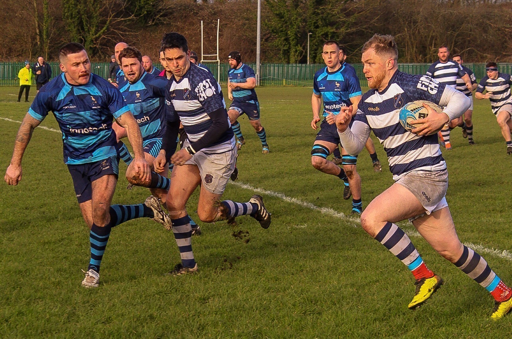 In recent fixtures Eccles have conceded points in the last 20 minutes games but there was no sign of this against Aspull as the forwards tightened their grip on the game, with locks Lillie and Donovan in particular making a big contribution to the set piece and line out accuracy. The Eccles pack remained composed and controlled in both attack and defence with good discipline shown in front of their goal line at 67’ when the visitors made a determined effort to break through but ultimately lost possession of the ball. Aspull’s last clear opportunity to score came a few minutes later when the right winger, who gave a good performance throughout, intercepted an Eccles pass at the halfway line and raced away only to loose his footing as he attempted to side step the untroubled fullback Parkinson and the score was denied him.