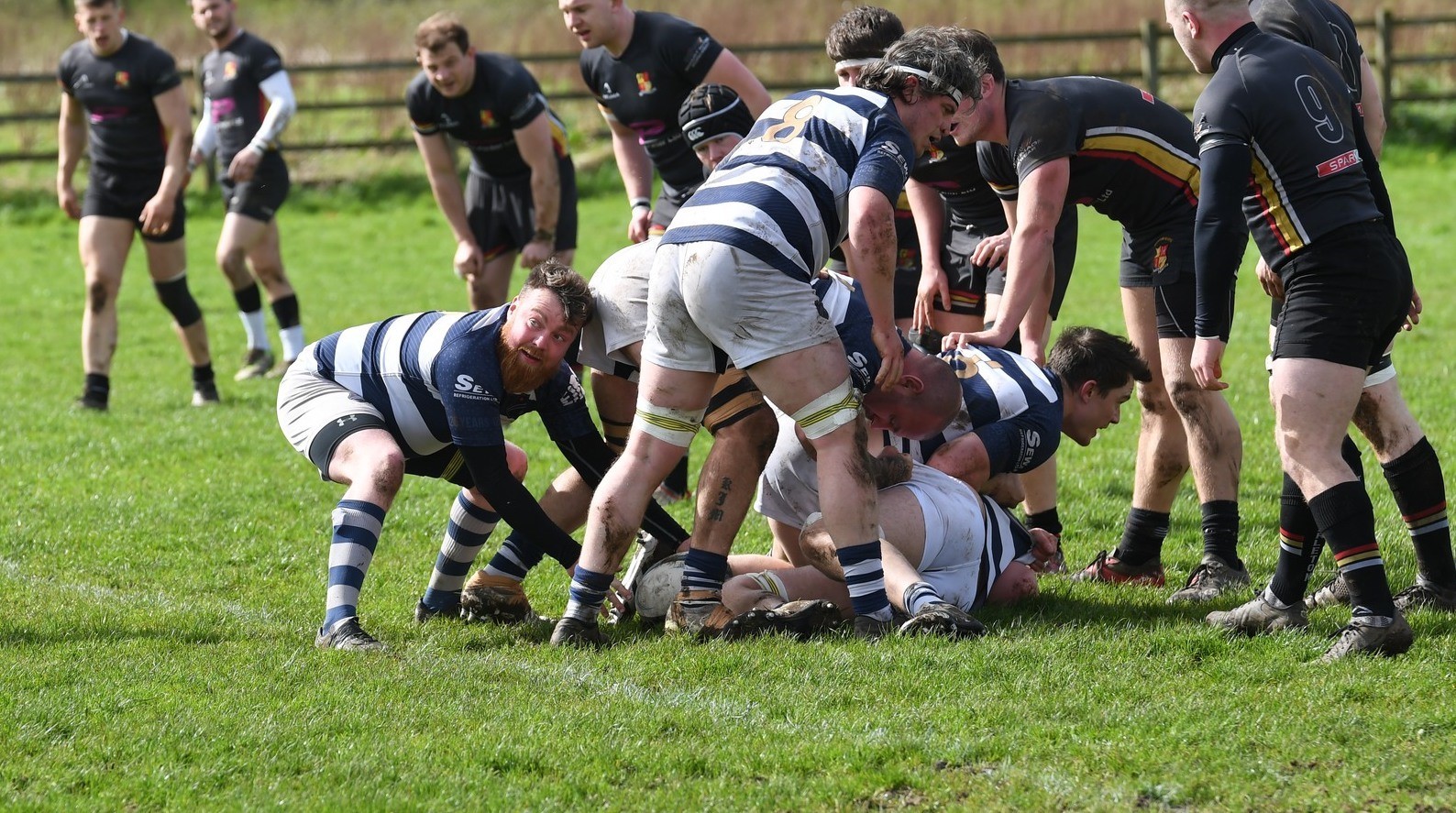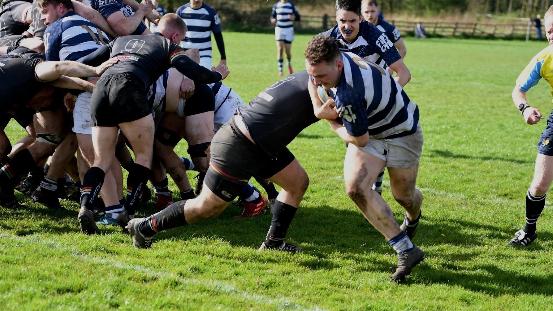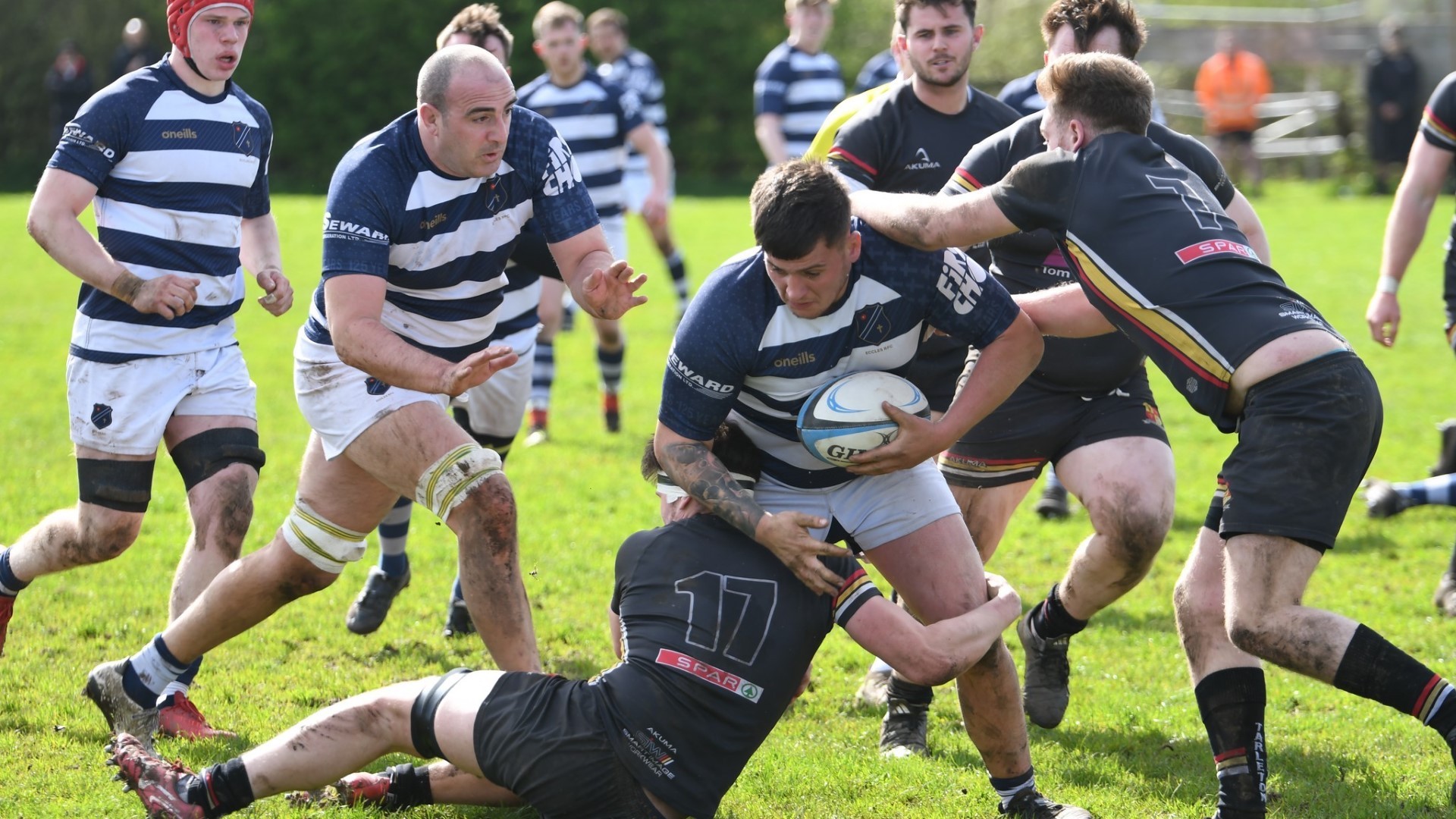 On 23” a 15m Eccles tap penalty was passed to Reed, who bulldozed through the defenisve line to take play close to the goal line but the ball was knocked-on in the ruck. On 26” Eccles were held up in the in-goal. On 30” Houghton broke through the line and offloaded in the tackle with one hand to the supporting Evans on his shoulder who was unable to catch the ball when he was clean through to score. On 34” an auspicious Eccles scrum 10m out offered the perfect platform but once again the ball was lost at the breakdown. At 38” Eccles secured the ball from a line-out inside the Tarleton 22 and forwards' pistons set up a lovely reverse pass back inside from Wright to Reed who once again charged in with ball to 5m from the goal line, but the resulting Long pass out to Simpson was caught by the wind, blown to ground, and hacked away by Tarleton, typifying the frenetic nature of play. Eccles had pinned Tarleton into their territory for almost the entire first half but were to about pay the price for their squandered chances. As the clock ticked down to half time, Eccles lost possession at an attacking ruck, the ball squirmed loose and the Tarleton winger took his opportunity and sped off up the blindside from inside his own half to score at the other end as the last play before the interval!