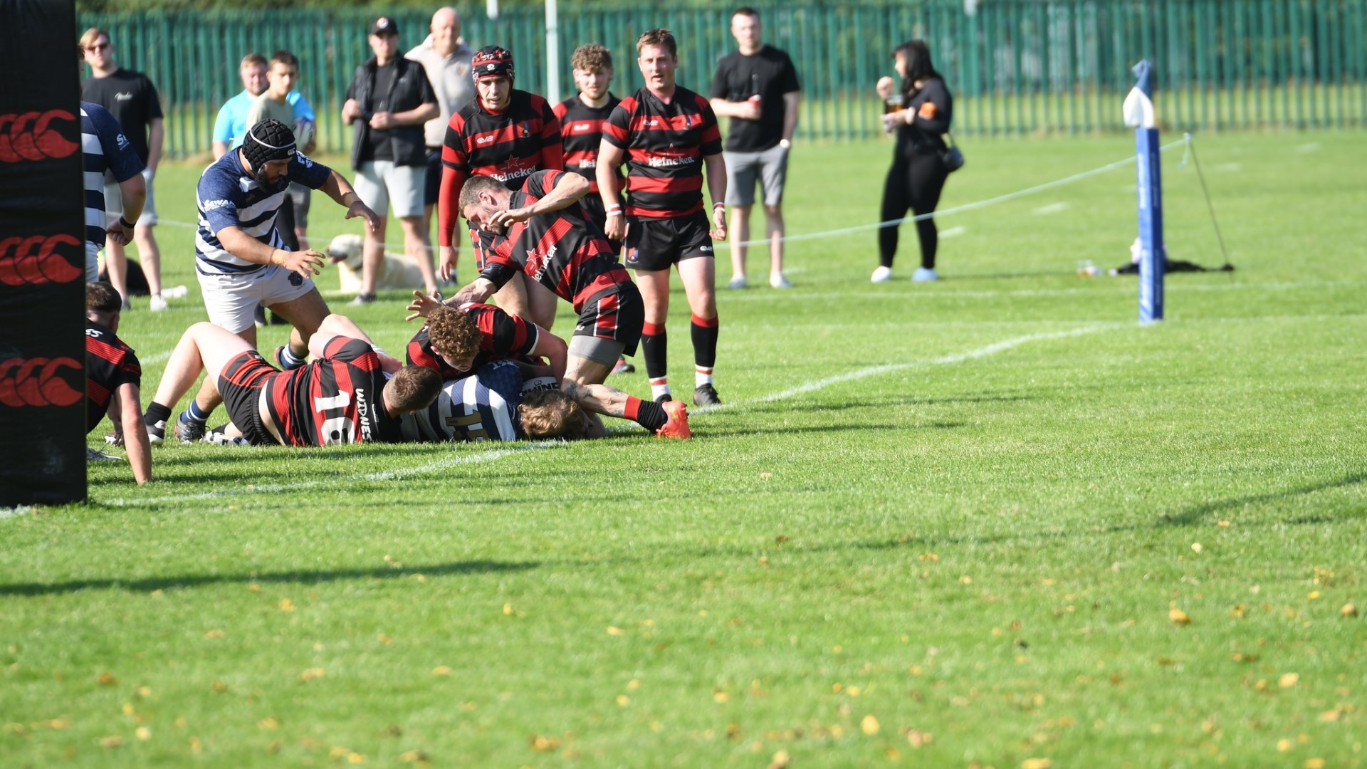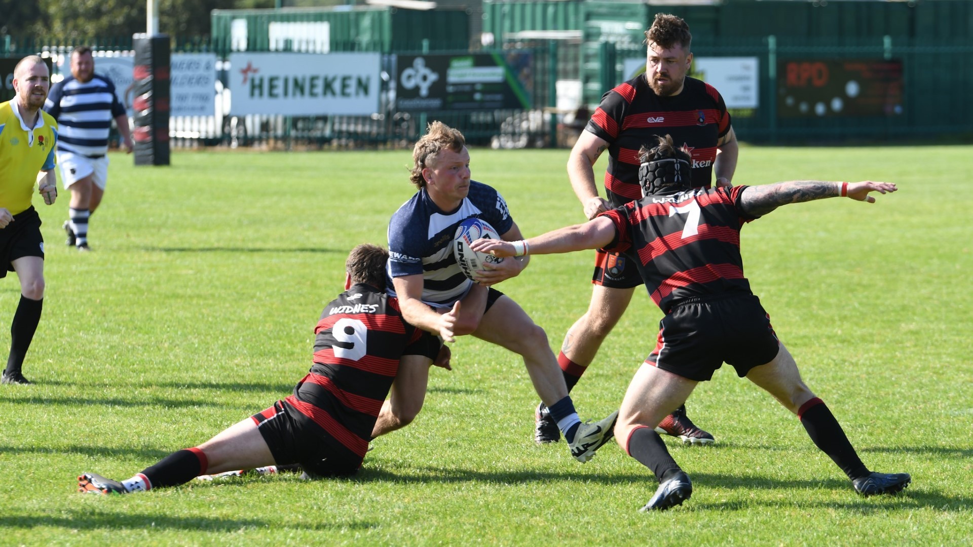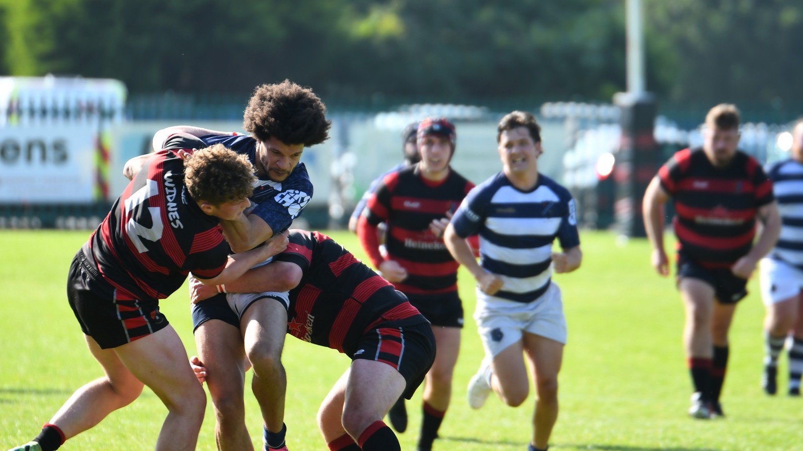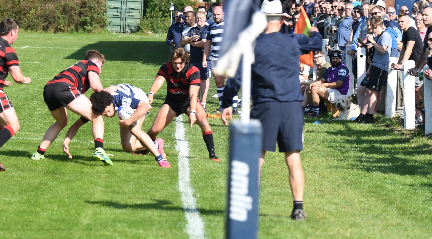 For the next 10 minutes Eccles strained to find the attacking cohesion necessary to break through a tight Widnes defence. Loosing outside centre Wilkinson to a Yellow card on 20' and then loosing Hooker Cox (C) to a dislocated shoulder on 23' further compounded their struggle. 14-man Eccles were galvanised into action and some effective work from Fly-Half Simpson put the hosts in the ascendency. Winger Ackers-Johnson threatened to break free on the right but was shackled by some good tackling. Accuracy in the line out and industry from the pack kept possession with Eccles inside the Widnes 22 and several several good attacking opportunities were fashioned by the half-backs, taking them close to an equalising score, but ultimately wasted with handling errors and decision making preventing progress. Eccles were still searching for a break through in opposition territory when Wilkinson returned to the field. The Widnes defence soaked up the sustained pressure and enjoyed some good fortune when an attempted clearing kick from inside the in goal area hit their post and the ricocheting ball was not pounced upon by Eccles. With 30 minutes played Widnes broke up field to move the game into the Eccles half.