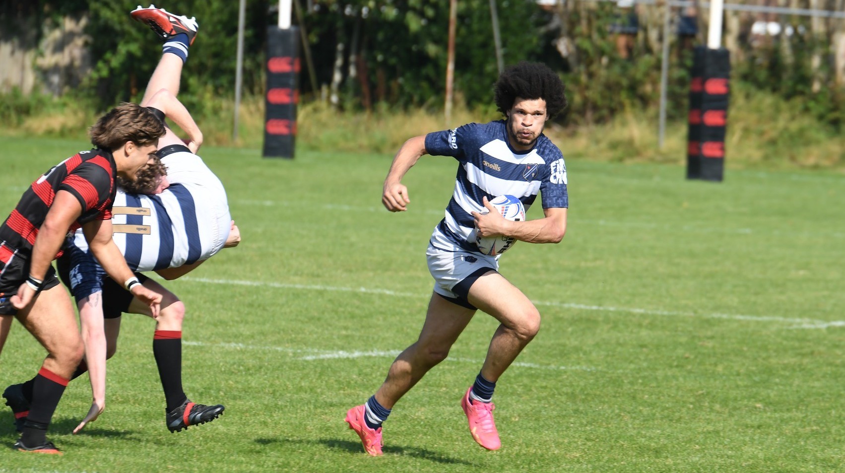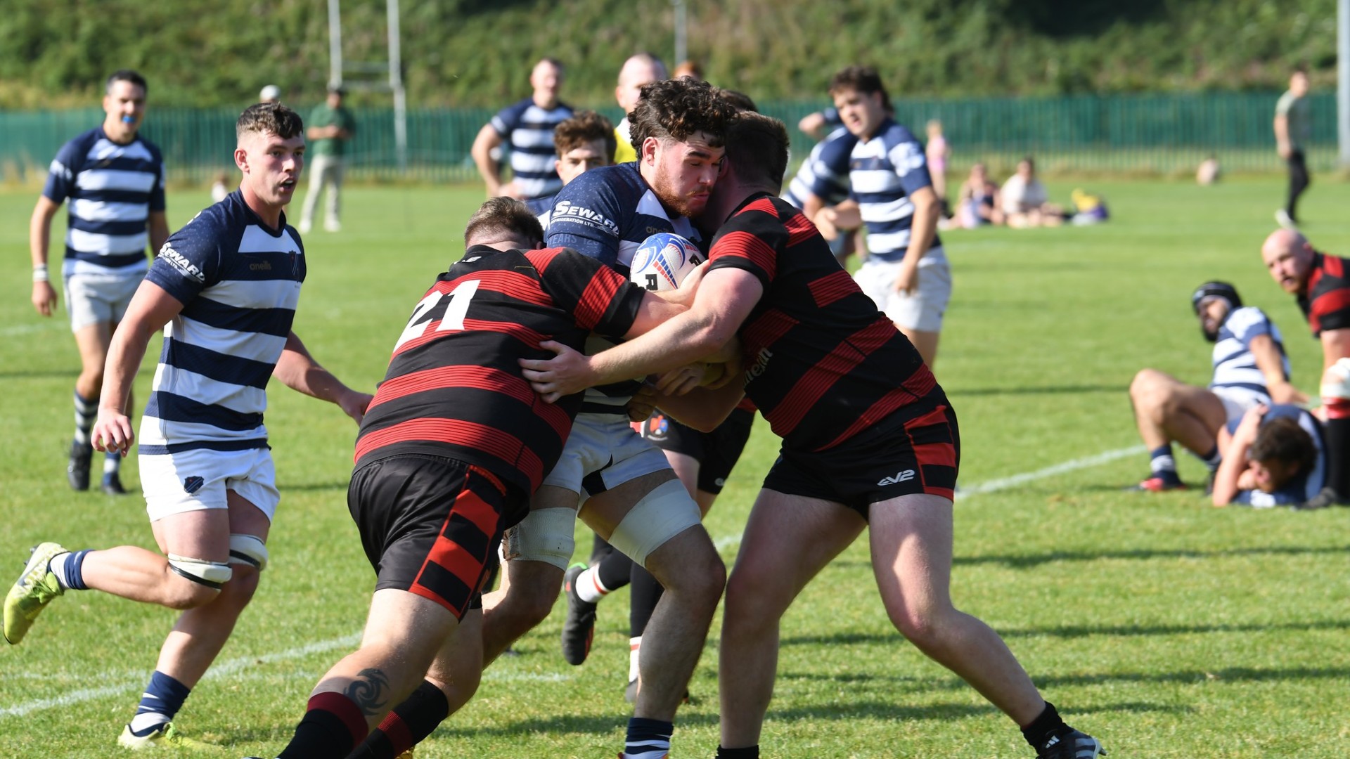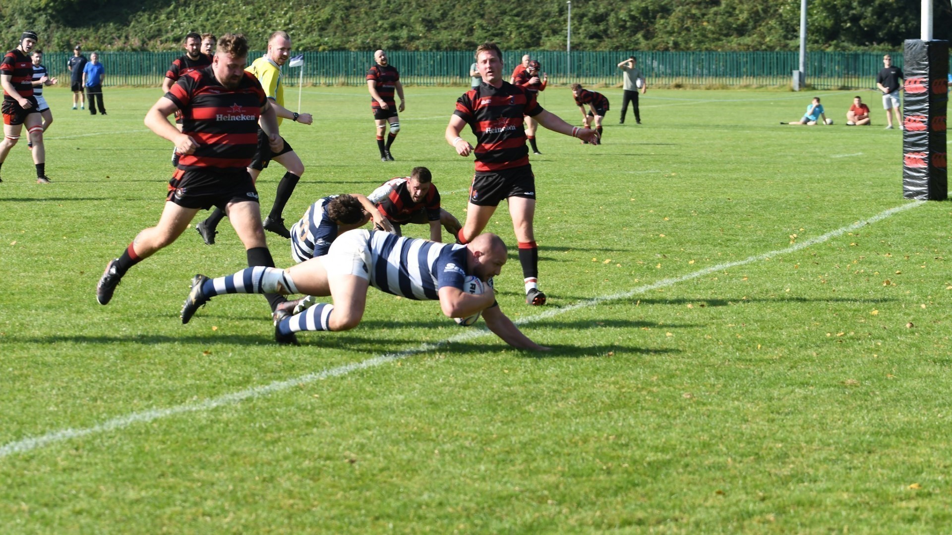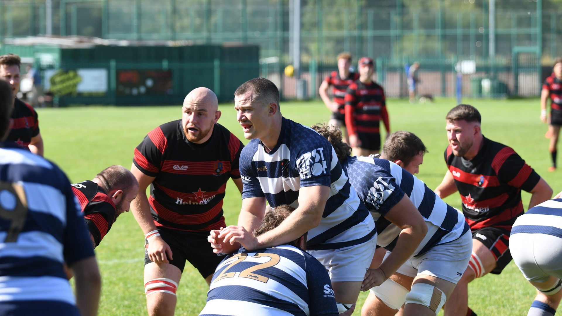 For the next 10 minutes Eccles strained to find the attacking cohesion necessary to break through a tight Widnes defence. Loosing outside centre Wilkinson to a Yellow card on 20' and then loosing Hooker Cox (C) to a dislocated shoulder on 23' further compounded their struggle. 14-man Eccles were galvanised into action and some effective work from Fly-Half Simpson put the hosts in the ascendency. Winger Ackers-Johnson threatened to break free on the right but was shackled by some good tackling. Accuracy in the line out and industry from the pack kept possession with Eccles inside the Widnes 22 and several several good attacking opportunities were fashioned by the half-backs, taking them close to an equalising score, but ultimately wasted with handling errors and decision making preventing progress. Eccles were still searching for a break through in opposition territory when Wilkinson returned to the field. The Widnes defence soaked up the sustained pressure and enjoyed some good fortune when an attempted clearing kick from inside the in goal area hit their post and the ricocheting ball was not pounced upon by Eccles. With 30 minutes played Widnes broke up field to move the game into the Eccles half.