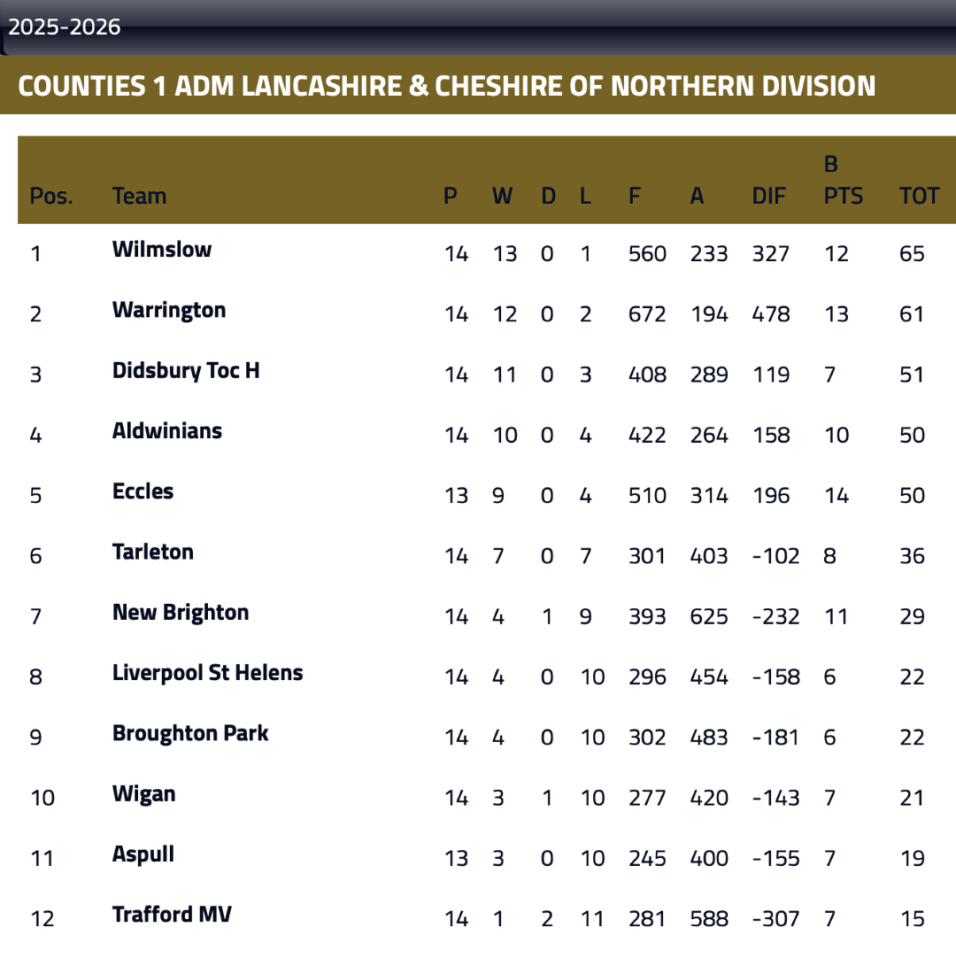 Trafford MV deserve credit for their determined spirit, fighting all the way to the end. Eccles will be pleased with their attacking play, nine tries, forward domination and improved discipline (4 penalties against in the first half, 3 penalties against in the second half) but will be less than satisfied with their defensive fragility, once again surrendering posession and points in the last 20 minutes; something they will want to address for the next game, when third placed Didsbury Toc H visit Eccles, on Saturday 14 February.