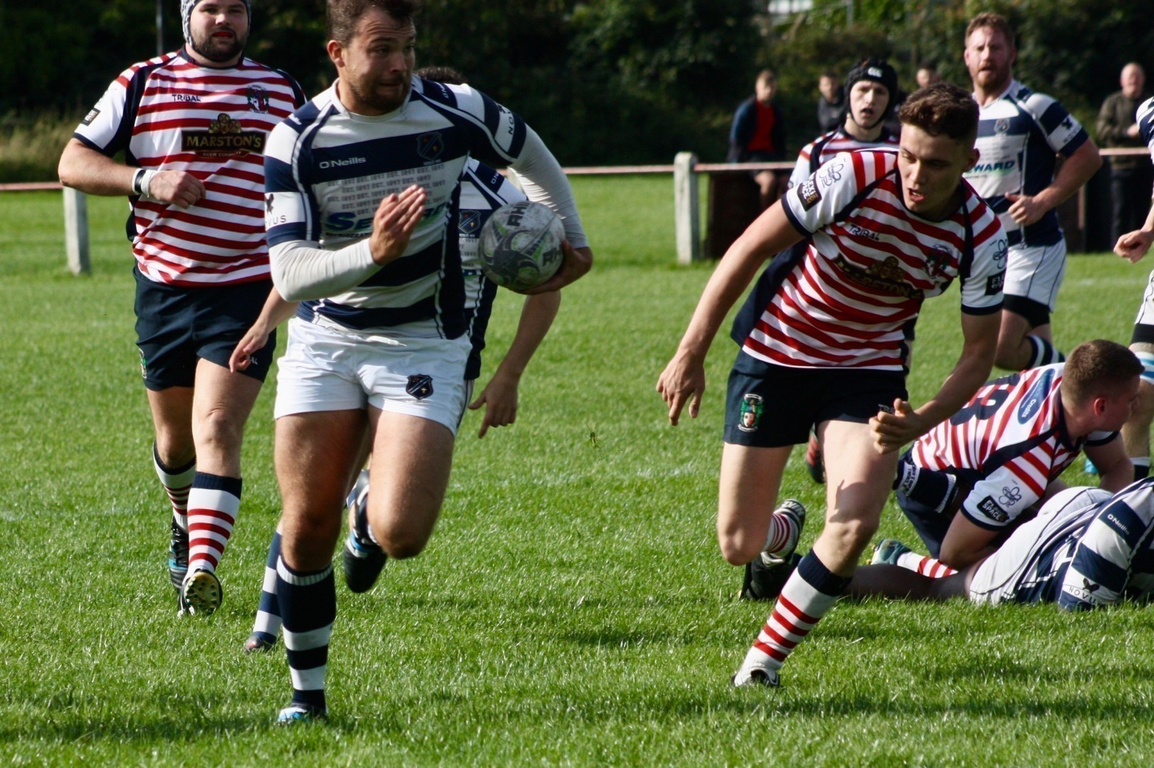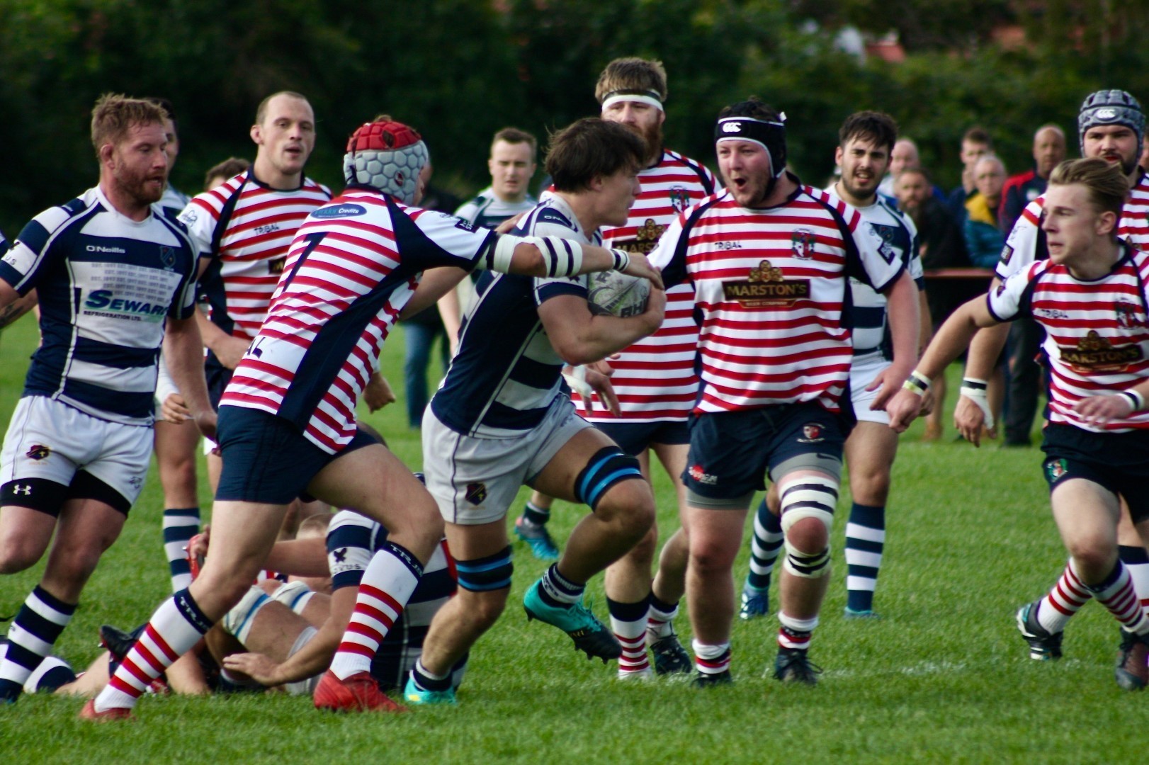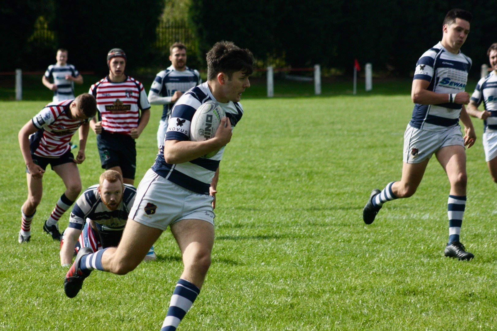 Eccles last faced Aldwinians, who now play their rugby in the Lancs ADM Premier Division, in 2017 at Level 7, and were expecting competitive test from the home team. The opening exchanges suggested the prospect of an even contest with play remaining in the middle of the pitch with both sides probing and spilling possession. Eccles were first to find their feet, winning a Penalty for ‘holding on’ following pressure at a scum on the edge of the home team 22. Chris Fortune’s foot settled the early nerves with the first points of the match and Eccles took hold of the game with assurance from this point forward, with a sequence of attacks down the flanks.