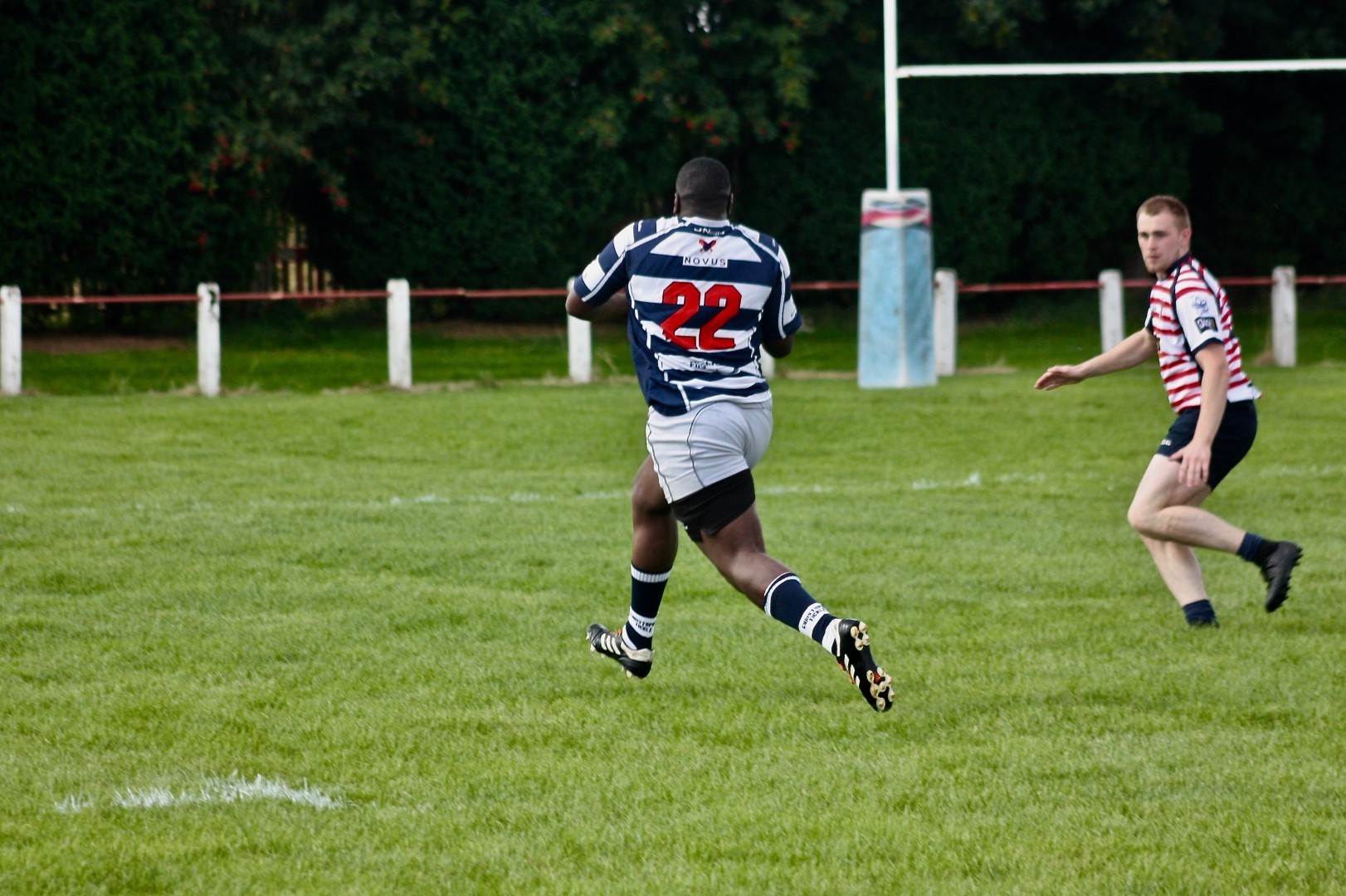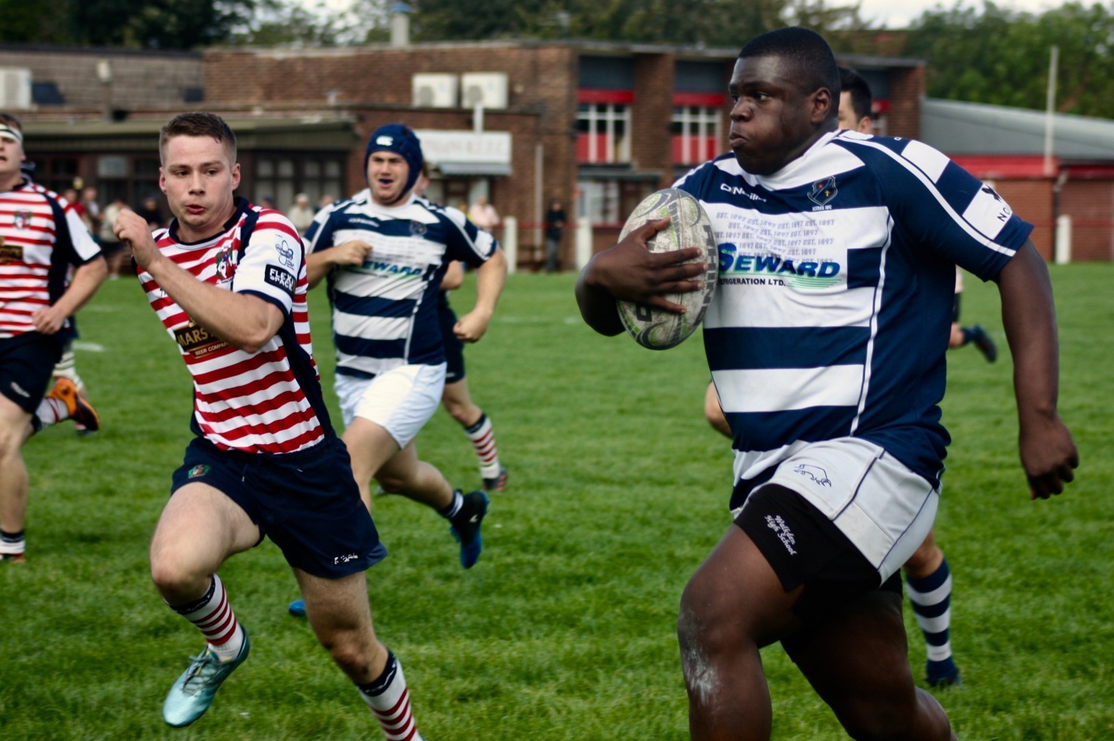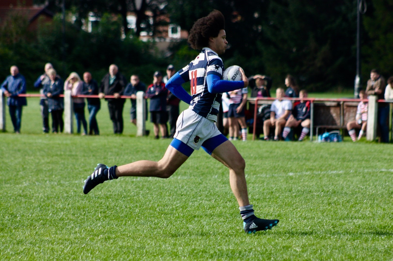 Damola Ayanlaja-Lowo proved distructive on the left wing. On his second opportunity to charge to the corner, he offloaded in the tackle to supporting Flanker Tony Haunschmidt who crossed the line to score the opening try on his Eccles 1XV debut. 10 minutes later Eccles fullback Harry Hutton scores his debut try in the right corner, following an attacking break from the base of scrum by number 8 Adam Christey. With half an hour played, 17 points up, Eccles are comfortable and switch off. Aldwinians make determined efforts to get themselves back into game and score down their left wing to the delight of the home spectators assembled along that touchline. Eccles, composed, respond with a left wing break of their own, released by the guile of Fortune, Damola powers through the defenders to score and regain the advantage. The conversion kick narrowly misses, caught by the wind. HT 7-22.