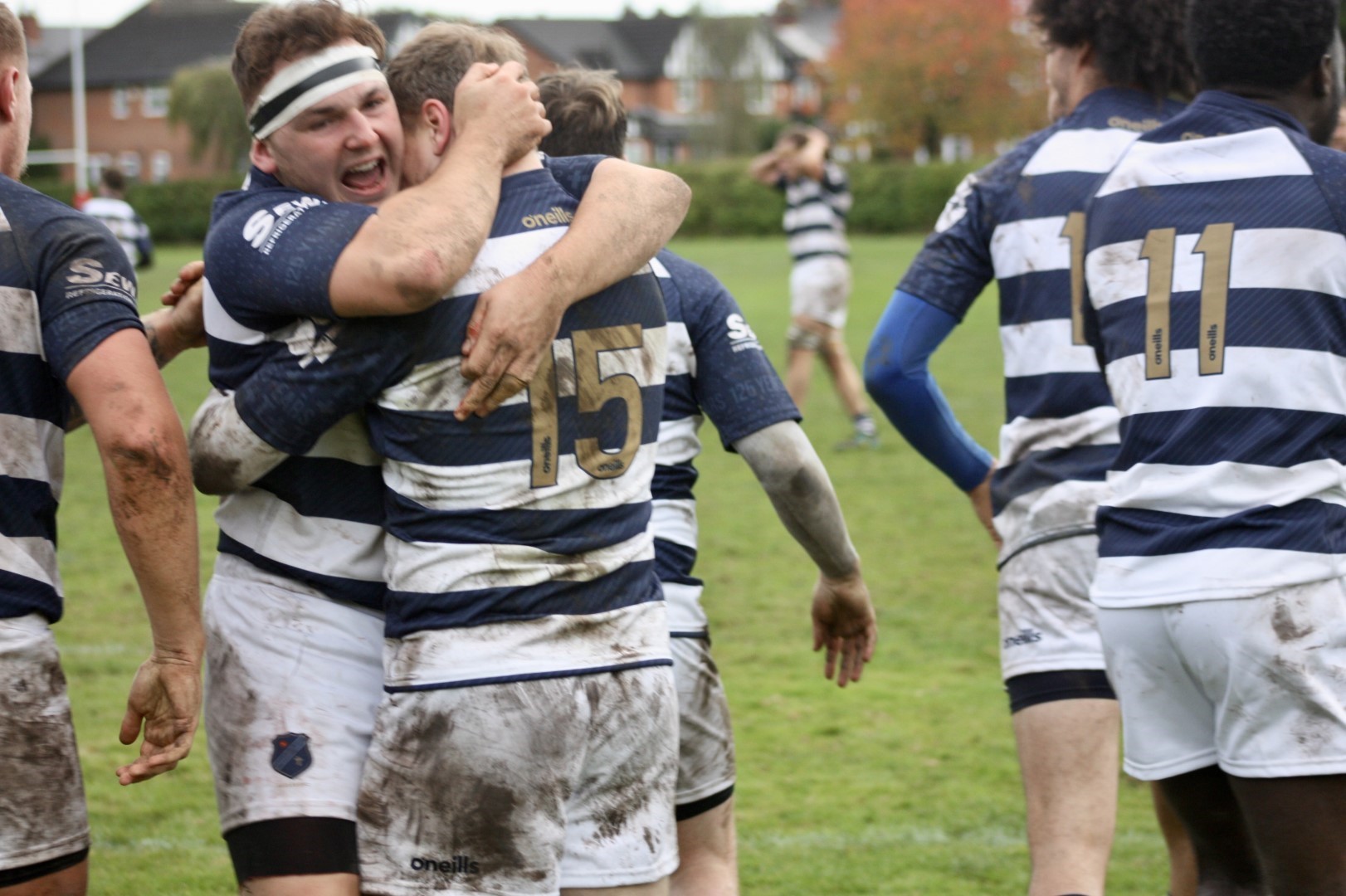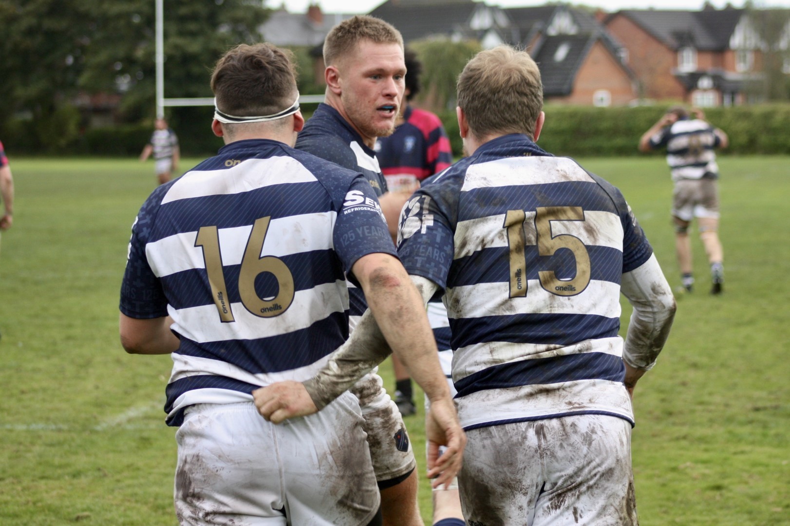 The last 10 minutes of the game was exciting and in truth the result could have gone either way. Yet another penalty conceded by Eccles in the middle of the pitch could have clinched it for TMV when they nudged ahead ahead 37-35 with 6 minutes to go but Eccles showed good spirit to fight back. With 3 minutes to go, from a scrum on the left, centre Jack Flanagan roared through the defensive lines carrying both ball and Trafford players to within 10m of the posts, the ball was quickly recycled out to the right flank where Fullback Will Parkinson was tackled 5m short of the line but the rapidly arriving back row cavalry in the form of 8 Adam Christey ensured attacking momentum and 7 Reece Walker assisted by winger Tim Balogun powered the ball over the line by the right corner flag amongst a pile of bodies. Euphoria! 37-40. Eccles were not done. With 1 minute on the clock Will Parky broke free up the left wing and this time was unstoppable, sliding across the line to score the final try of the game and claim the victory. 37-45.